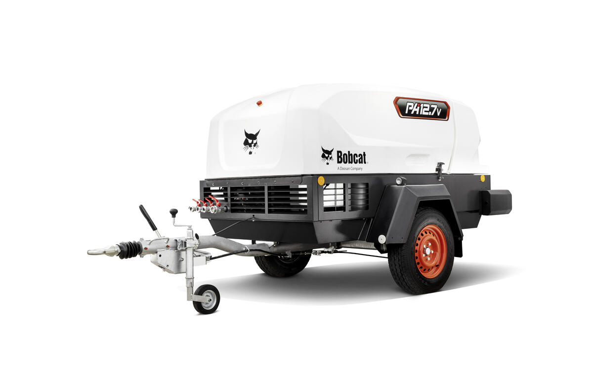 Bobcat PA 12.7v – Výkon 5,2–7 m³/min s nastavitelným tlakem 5,5–12,1 bar (FlexAir). Ideální pro tryskání, maloprofilové vrtání, stříkání betonu nebo instalaci optických kabelů.