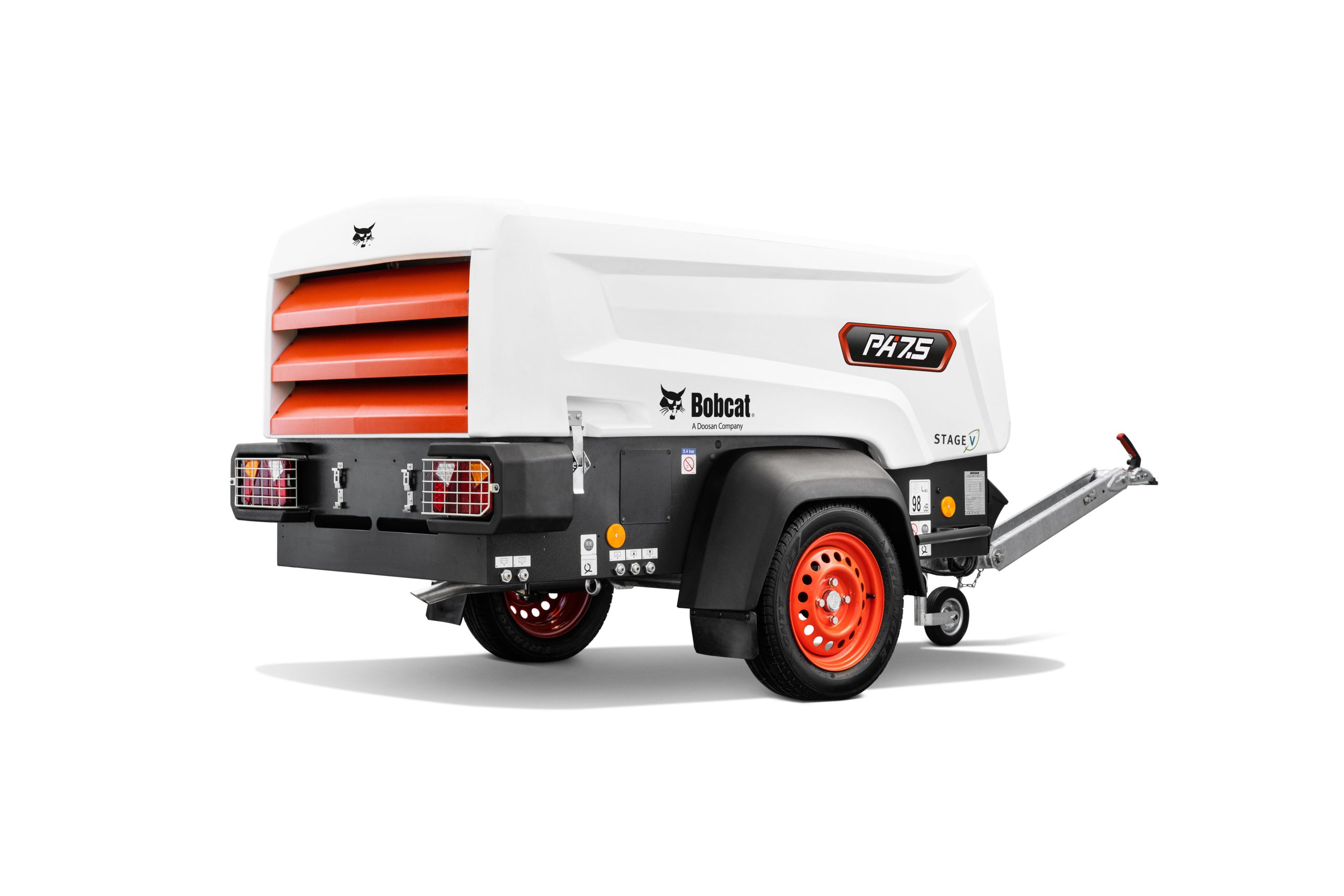 Bobcat PA 7.5 – Mobilní kompresor s výkonem 5 m³/min při 7 bar, vhodný pro pneumatické nářadí, bourací práce, pískování či zafukování kabelů. Díky hmotnosti pod 750 kg snadno přenosný.